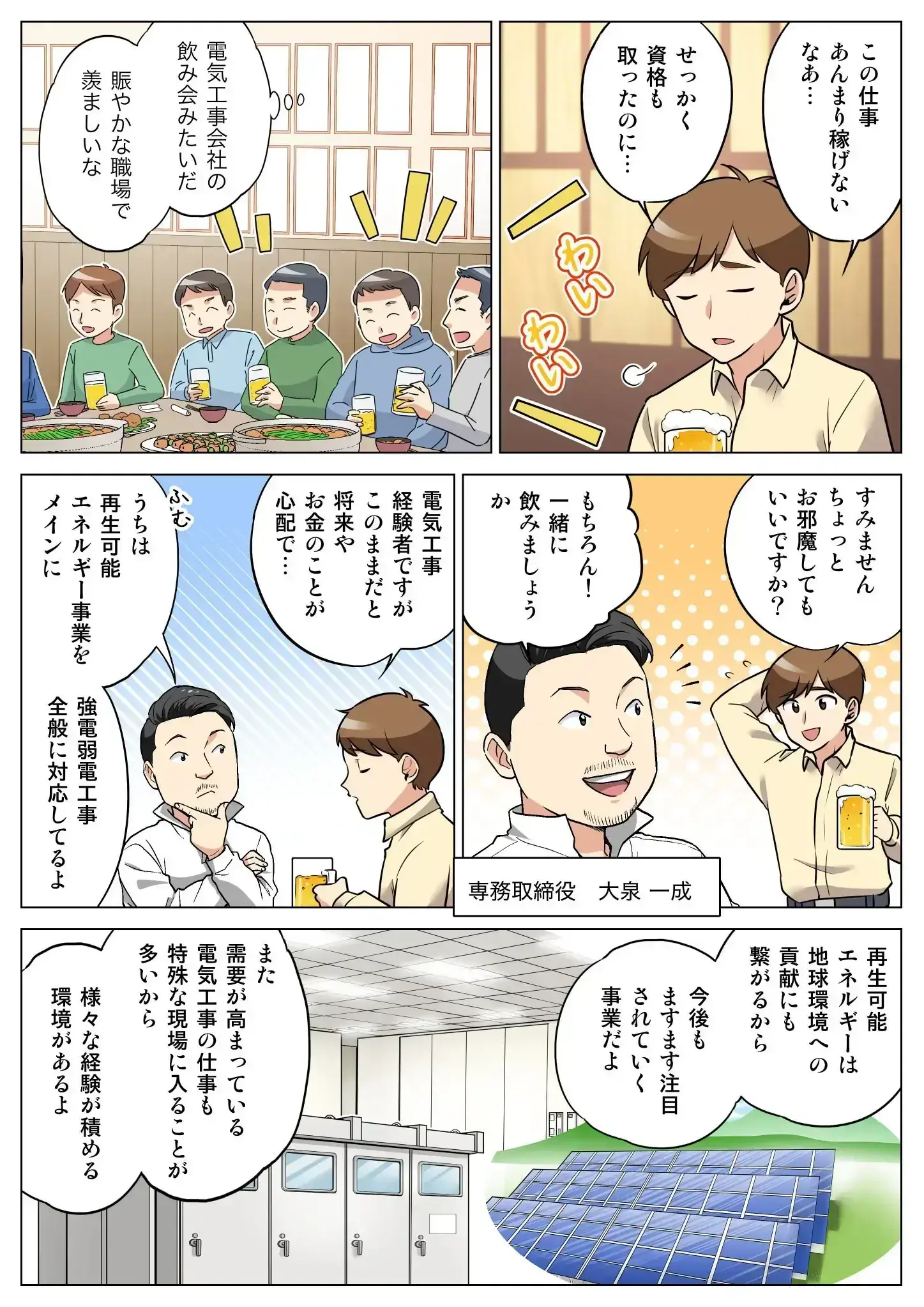 再生可能エネルギー事業、電気工事業、給排水空調換気設備業を中心に手掛ける会社です。